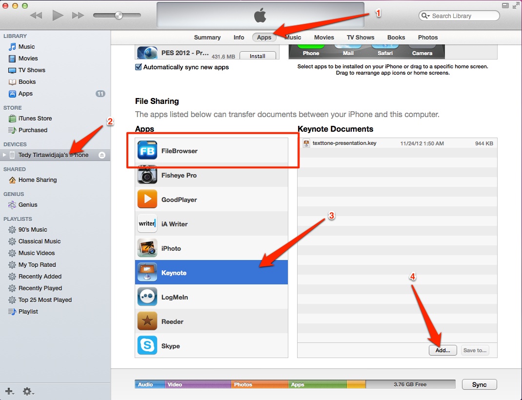 Cara lain adalah dengan menggunakan iTunes. Dalam contoh tadi teman saya sudah memiliki aplikasi Keynote di iPhone-nya. Keynote adalah aplikasi dari Apple untuk membuat presentasi, sama seperti Microsoft Power Point. Dari iTunes kita bisa memindahkan file presentasi langsung ke fitur file sharing yang disediakan oleh Keynote. Contohnya seperti gambar screenshot di bawah ini :